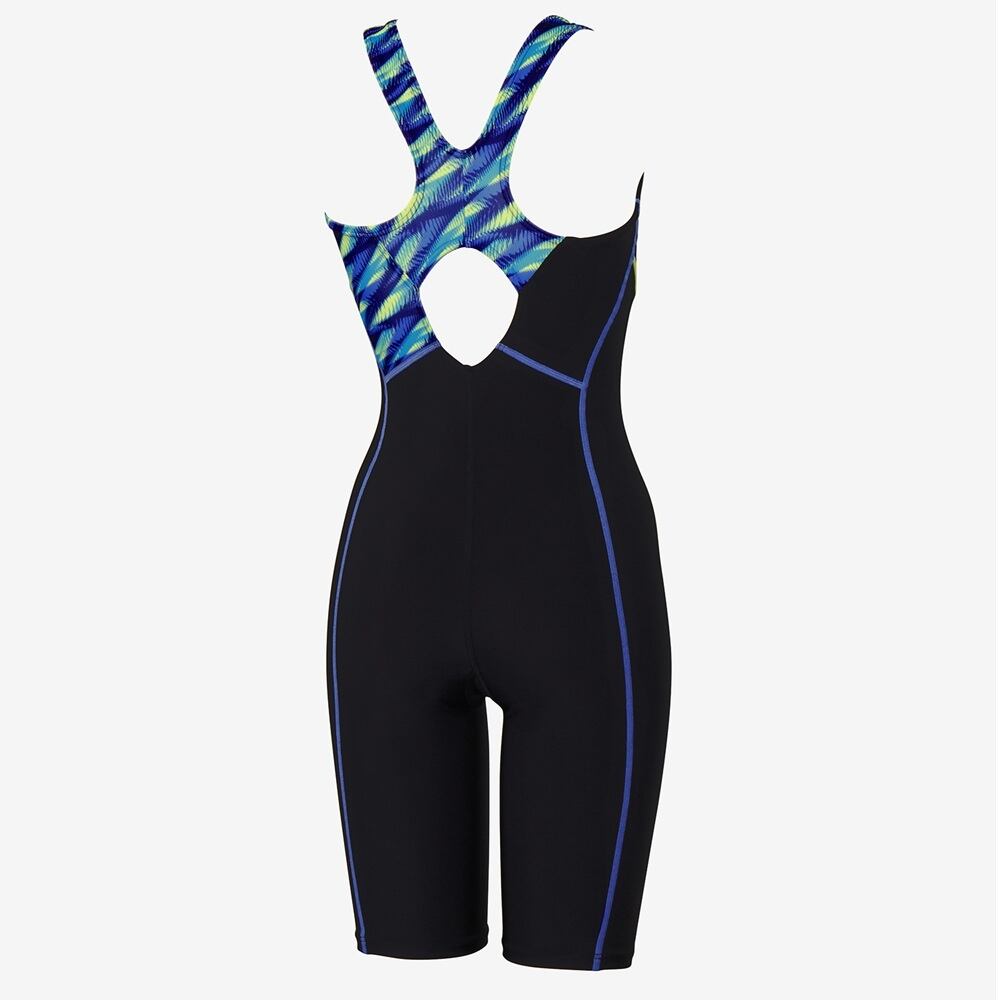 股下のシームをなくし、プルブイを挟んだ際の擦れや開脚動作のストレスを軽減。クロッチ部分には肌あたりのよい柔らかな素材を使用しています。露出を極力減らした小さな背穴。食い込みを防ぐために幅広の肩ストラップを採用しています。着脱時のもたつきが少なくズレにくく動きやすい、縫い込み式のカップ付き。膝上までの4分丈です。