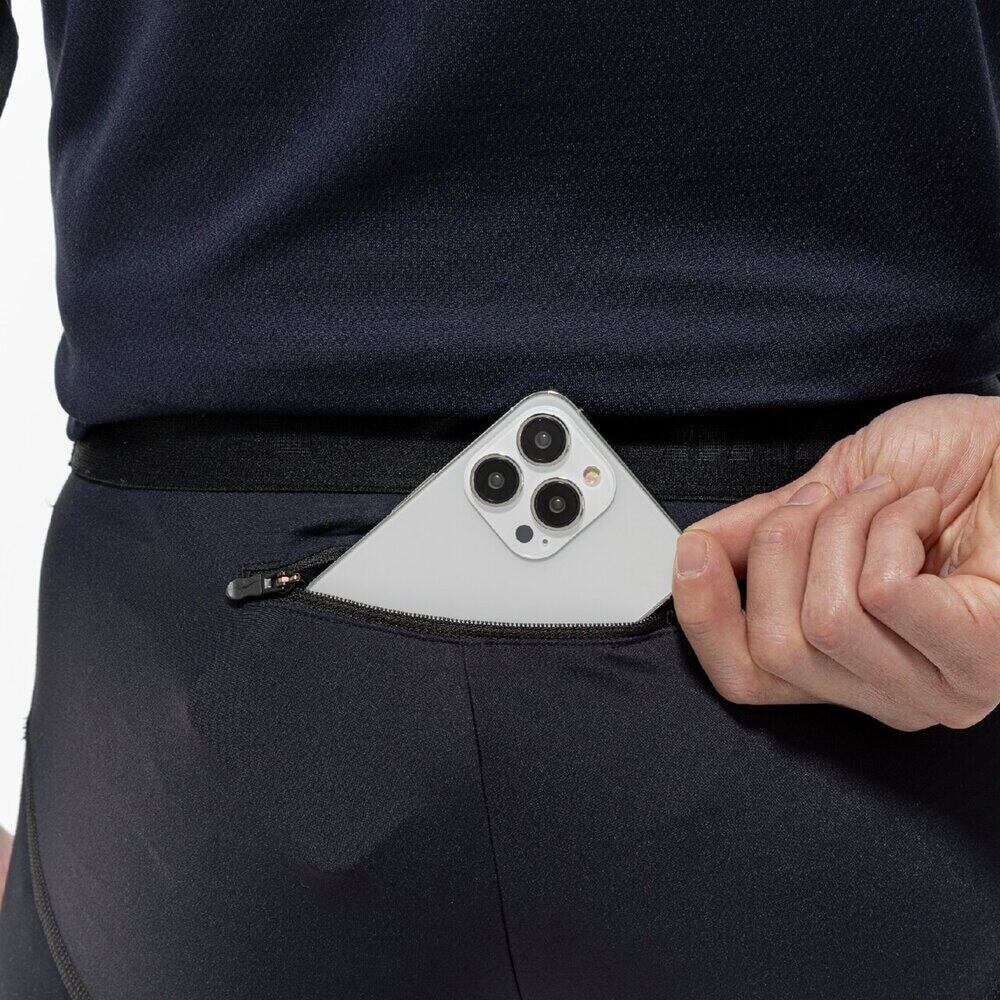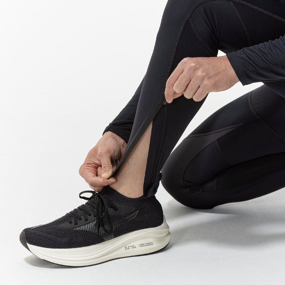 全身ではなくパフォーマンスへの影響が大きい特定の筋肉だけを温めることで、衣服内温度の上昇を抑える設計にしています。背面にはスマートフォンや小物を収納できるジップポケット付き。肌当たり軽減に配慮したフラットシーマ設計で、裾には靴を履いたままでも脱ぎ履きがし易いジップ付き。
