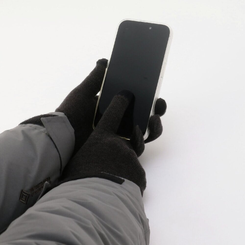 インナーとしても1枚使いでも使用でき、親指・人差し指・中指の先に導電糸を使ったタッチパネル対応仕様の手袋です。
