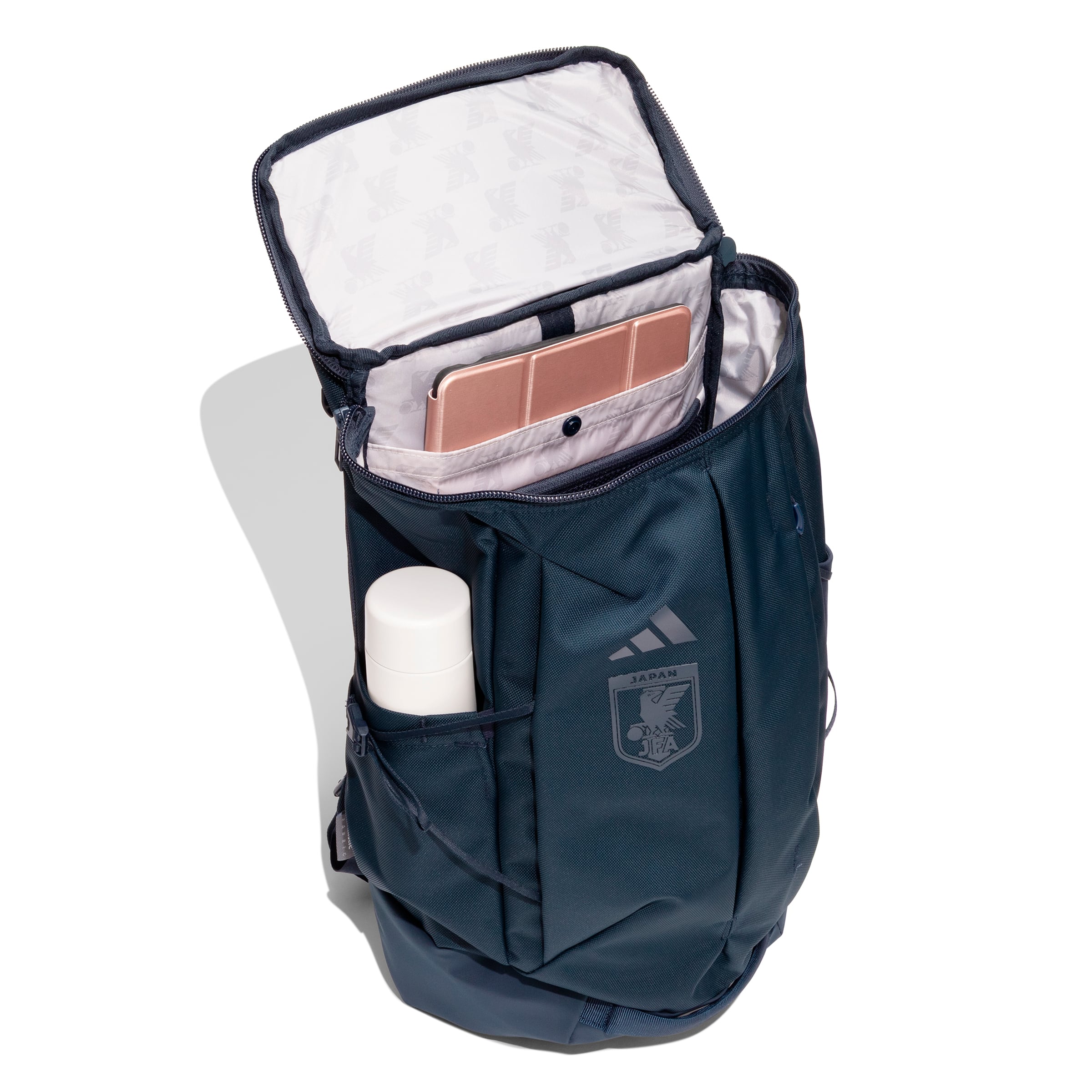 バッグ上部にはサッカー日本代表 2026 ユニフォームと同じグラフィックがプリントされており、またライニングには八咫烏のAOPを使用。