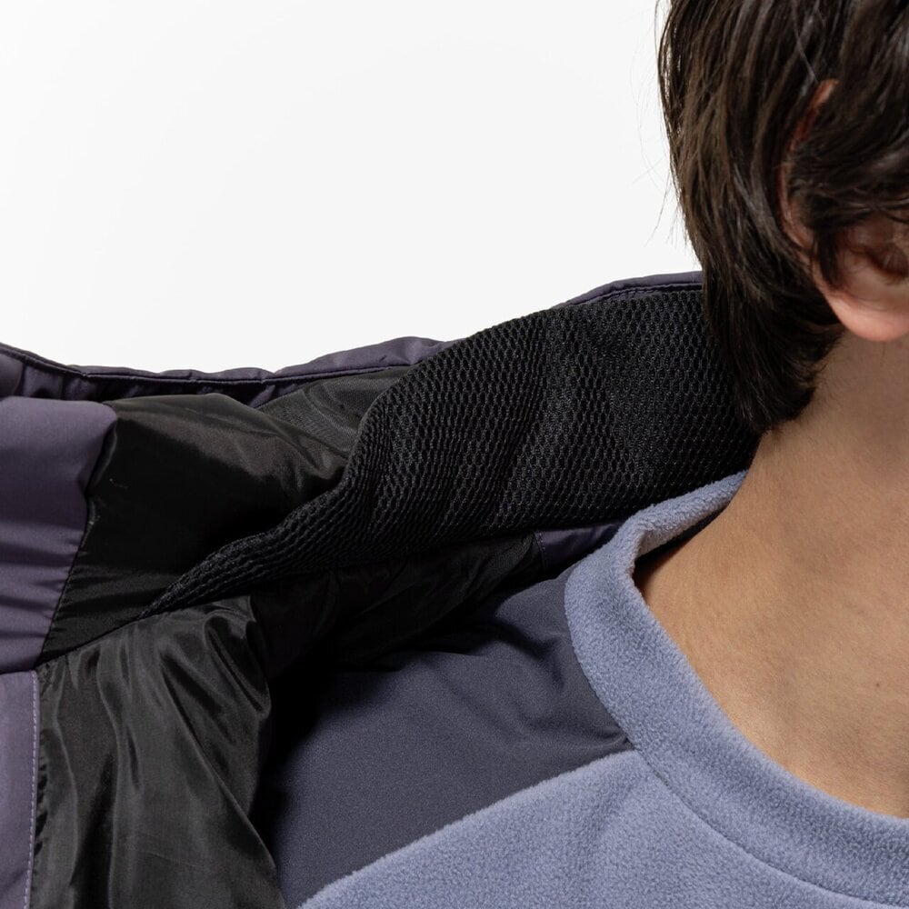 ■自立フード&立体衿により、フードを下ろした状態でも首回りをカバーし、冷気の侵入を抑える。