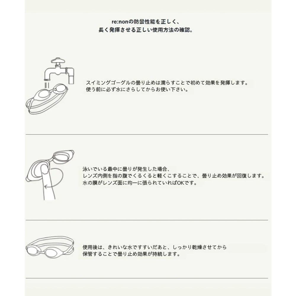 高いくもり止め機能を発揮するre:non(リノン)を搭載しており、くもり止め機能が低下してきた際、アイカップの内側を指で軽く拭くことで、くもり止め機能を長持ちさせることが可能。