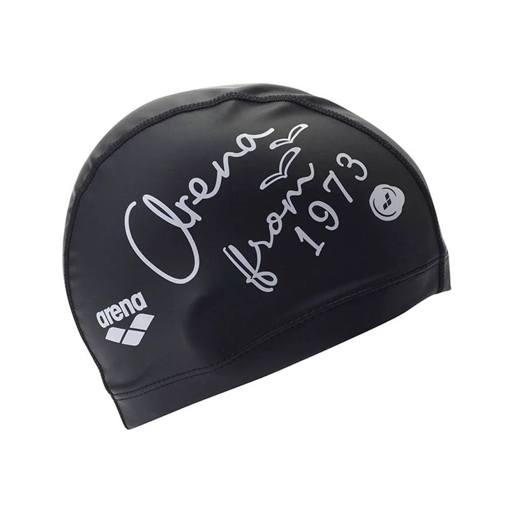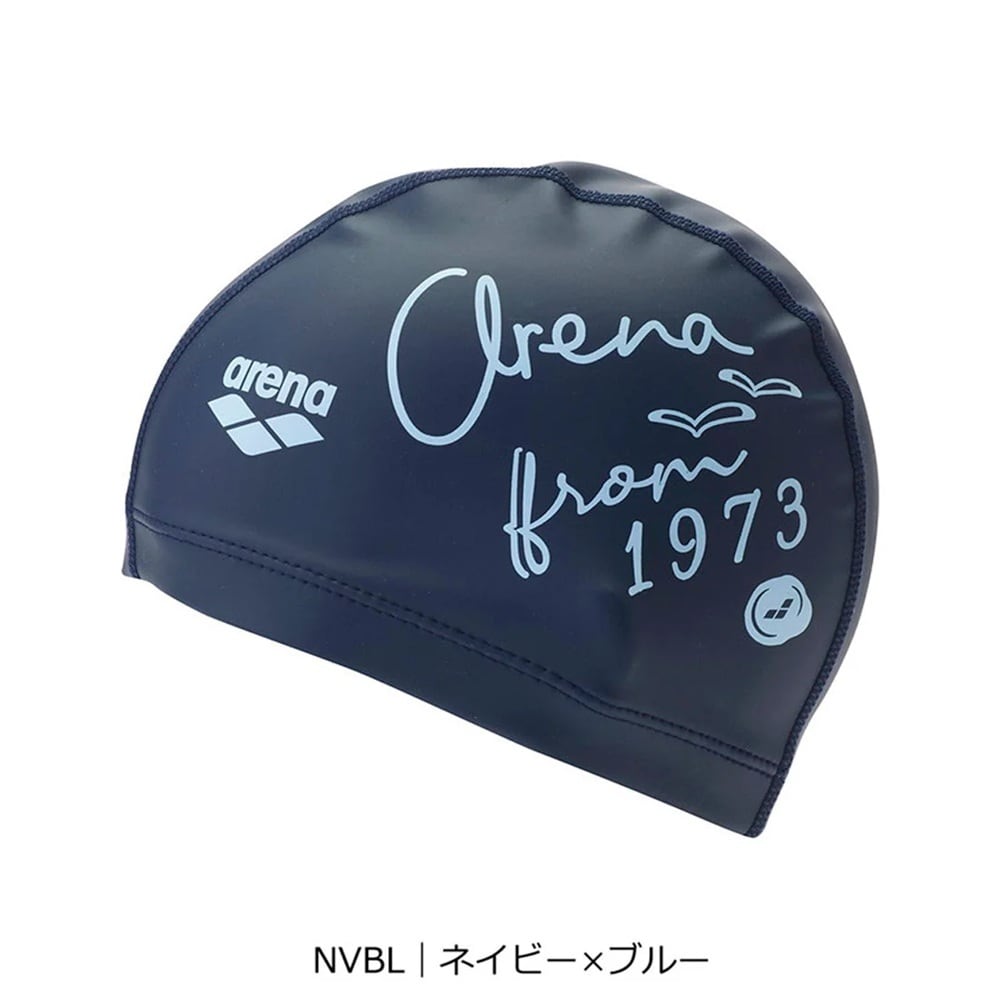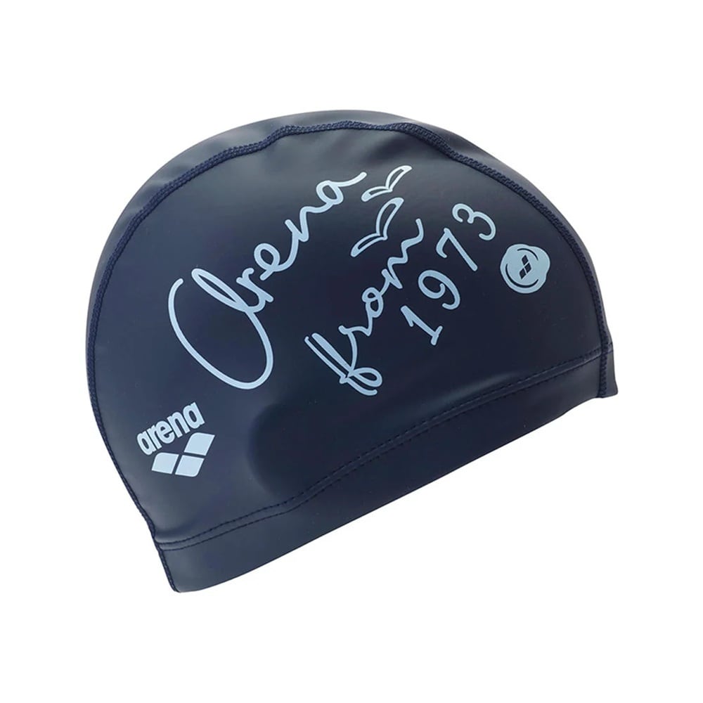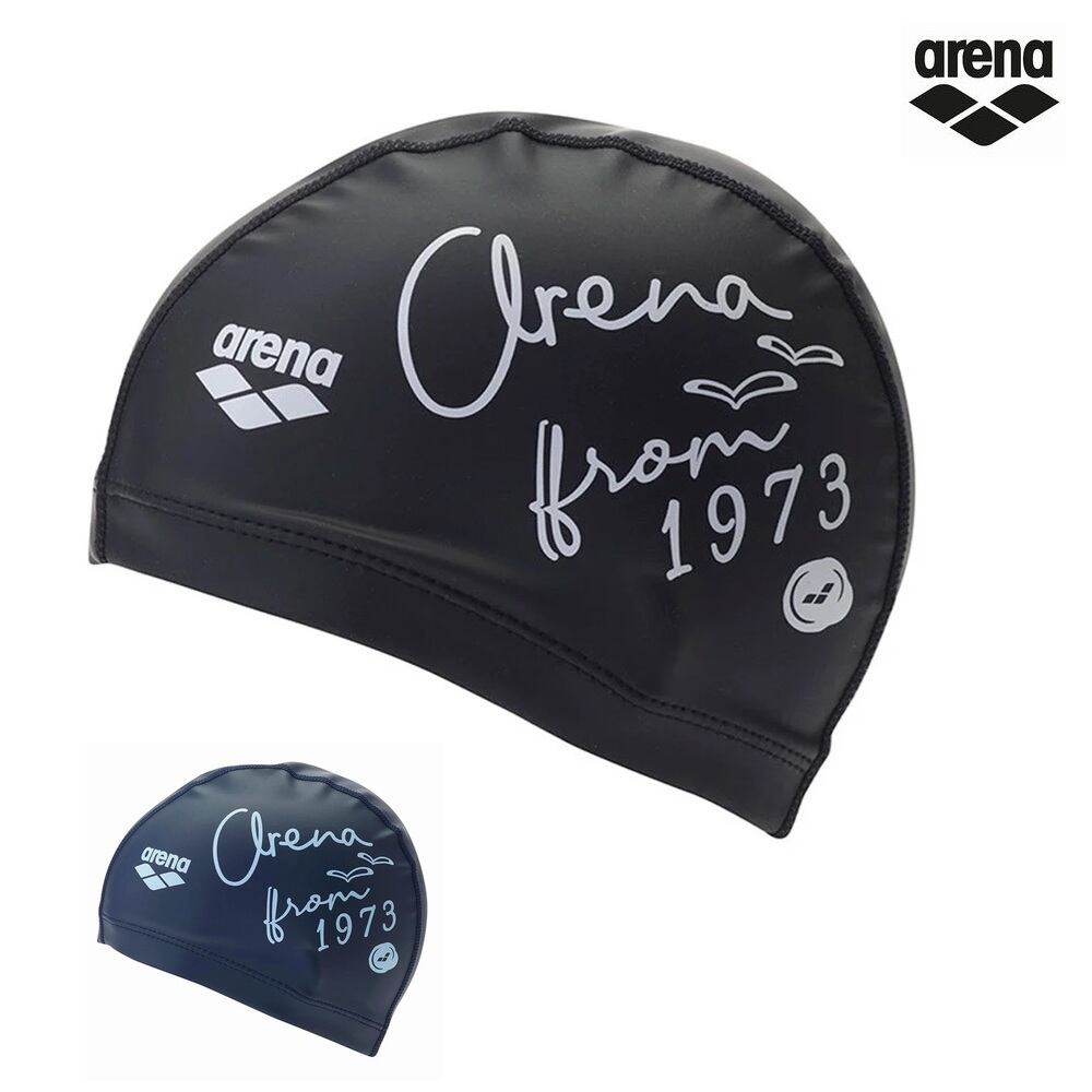 「arena from 1973」をレター調でPOPに表現したかぶりやすく髪も濡れにくい、2ウェイシリコーンキャップ。