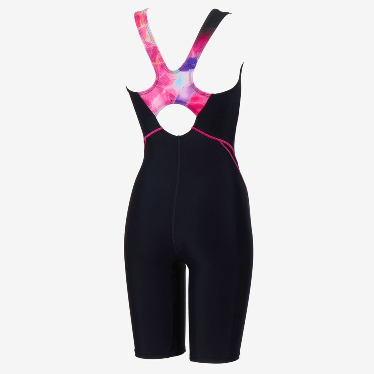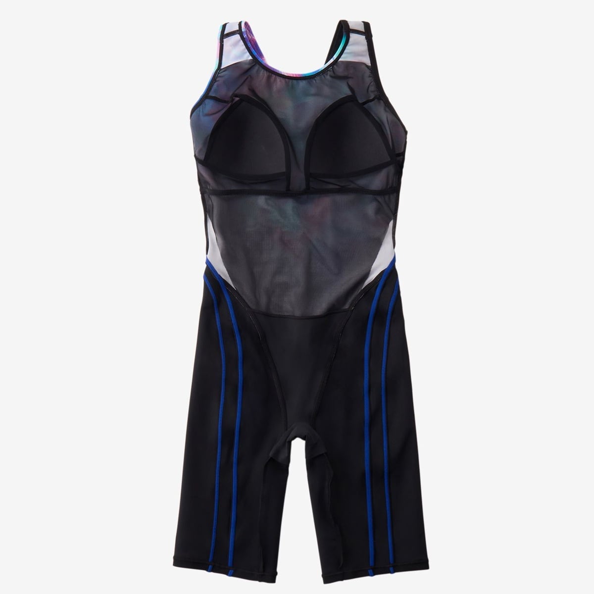 露出を抑えた小さな背穴、食い込みにくい幅広の肩ストラップを採用。透けにくく安心感のある厚みと、前身頃プリント生地裏には水はけのよいメッシュ素材の裏地、シャドーライナーをつけ、前身頃の透け軽減と程よいフィット感をプラス。着脱時のもたつきが少なくズレにくく動きやすい、縫い込み式のカップ付き。クロッチ部分には肌あたりのよい柔らかな素材を使用しています。股下はハギをなくし、擦れや脚動作のストレスを軽減。膝上までの4分丈です。UVガード(UPF30-50+、紫外線カット率90%以上)、はっ水(非フッ素はっ水)機能付き。