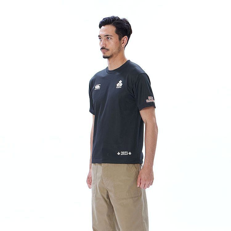 オフィシャルパートナーであるJRFU(日本ラグビーフットボール協会)とのダブルネームで実現した、ジャパンスペクテイターコレクションになります。こちらは、吸汗速乾性に優れ、衣服内を常にドライで快適な状態に近づけるFLEXCOOL CONTROL(フレックスクールコントロール)機能を持つリサイクルポリエステルを使用したTシャツです。フロントにカンタベリーロゴと、桜のエンブレムがプリントされており、左袖のラグビー日本代表の愛称である「BRAVE BLOSSOMS(ブレイブ ブロッサムズ)」がアクセントになっています。普段使いはもちろんですが、試合時の観戦や日本代表の応援用として着用できるオフィシャルライセンス商品です。